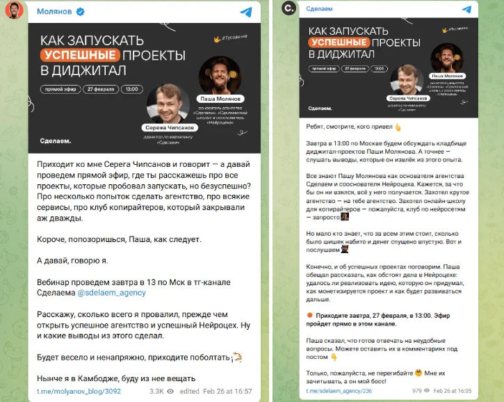 Когда запускал первый эфир в канале «Сделаем», я анонсировал его везде: в каналах-сателлитах, в рассылке, в других соцсетях. Еще до эфира в канал пришло больше 300 новых подписчиков. А сам эфир я делал как мини-вебинар: серьезная тема, презентация, четкий план. Это добавило веса и дало хороший результат.