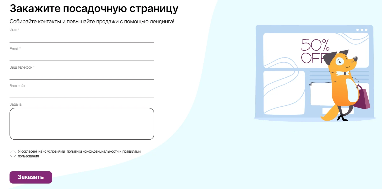 Задача блока — зацепить взгляд (за счет яркого фона, контрастной кнопки действия) и убедить оставить контакты. Важно не перегружать блок деталями, а форму — количеством вопросов: чем проще, тем эффективнее.