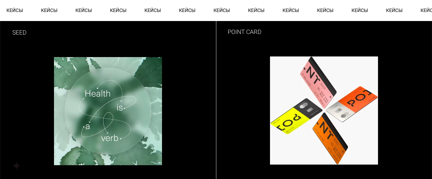 В блоке представлены примеры работ или кейсы — оформляются в виде заголовков с кратким вовлекающим описанием (более подробная информация может быть доступна по ссылкам на отдельным страницам).