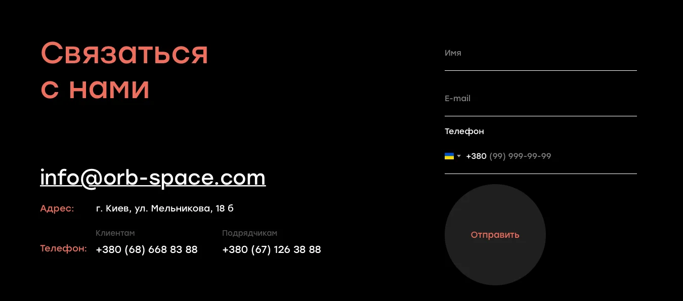 Обычно они находятся в «подвале» (футере) лендинга — включают телефон, почту, ссылки на социальные сети, адрес, карту проезда. Часто там еще форма для вопросов или предложение перезвонить.