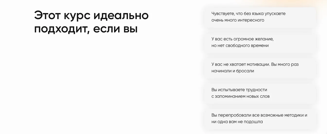 Блок пытается зацепить потребности целевой аудитории, чтобы люди узнали в описании себя. Он чаще нужен для более сложных продуктов (например, курсов японского), чем понятных, которые интересны большинству (например, услуги маникюра).