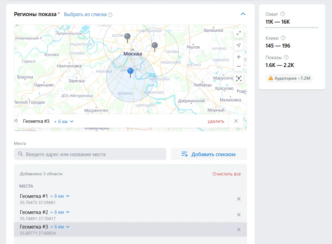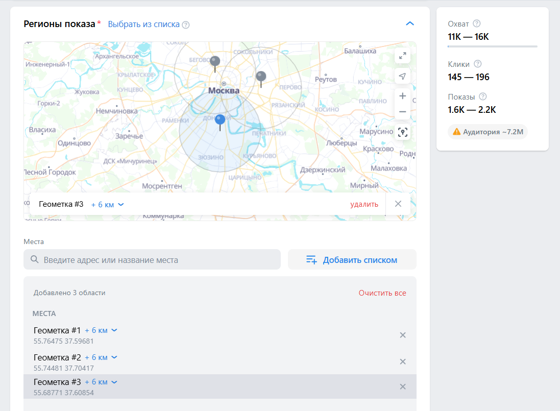 Полезная опция для локальных проектов — «Указать на карте». Мы можем начертить областями с определенным радиусом те локации, которые нам интересны — не только город, но и несколько близлежащих поселков. Или можем выбрать районы города в сети покрытия нашей доставки и исключить дальние районы. Реклама будет показываться людям только из выбранных районов.