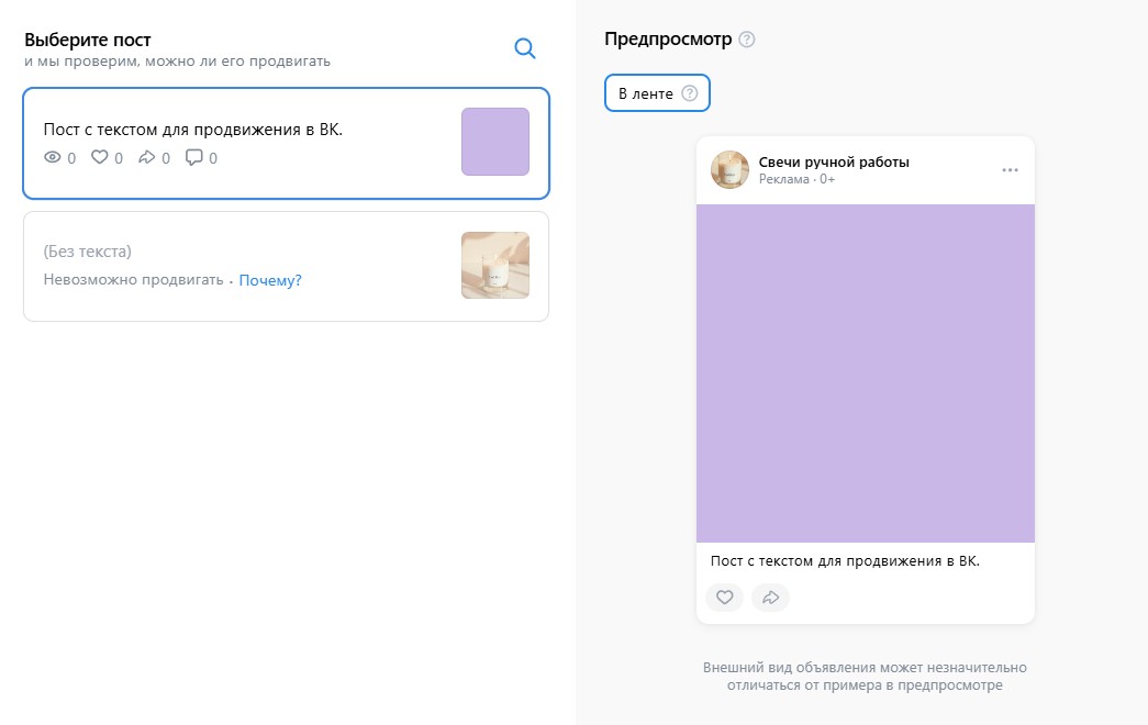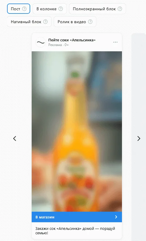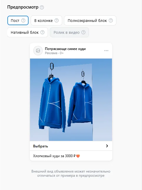 Пост, видео, клип, статья. Это формат из раздела «Узнаваемость и охват». В нем можно продвигать видео и трансляции, клипы и статьи, которые загружены в вашем профиле. Пользователи, которые увидят рекламу, смогут взаимодействовать с контентом — просматривать, делиться им, оставлять реакции и комментарии.