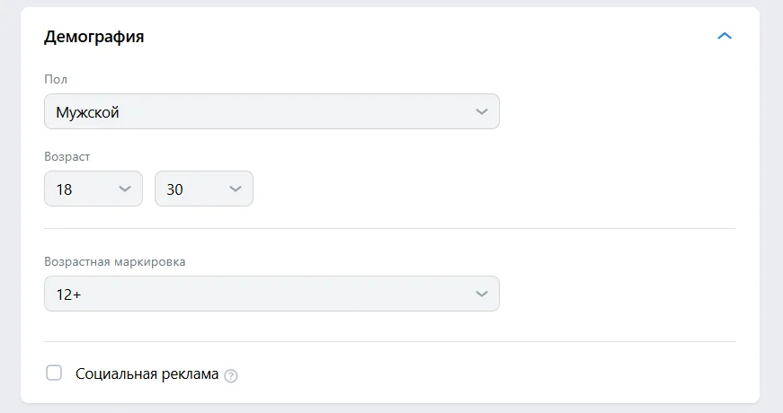 Здесь же есть графа «возрастная маркировка». Ее нужно устанавливать в случаях, установленных законодательством РФ. И чек-бокс «социальная реклама». Он означает, например, что реклама показывается в благотворительных целях.