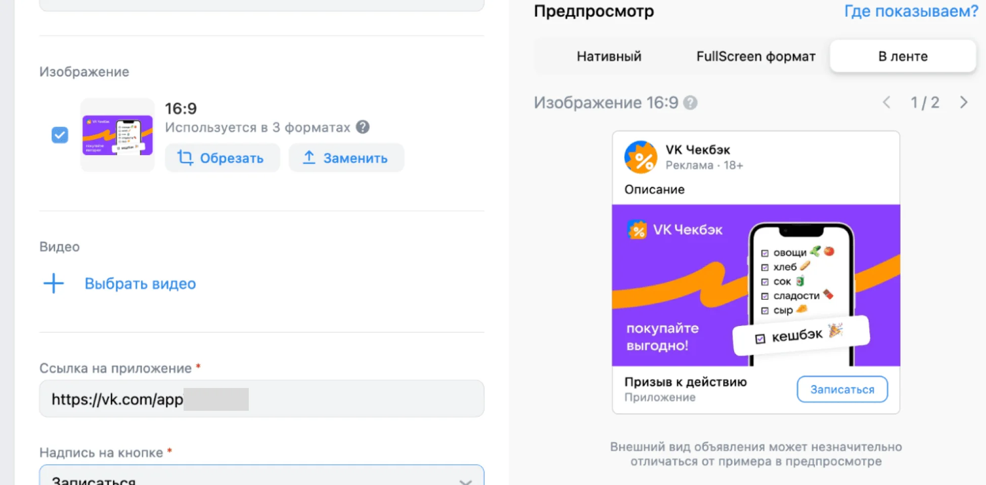 В рекламном объявлении нужно указать заголовок до 40 символов, описание до 16 384 символов, текст рядом с кнопкой до 30 символов и данные о рекламодателе по закону «О рекламе». Текст кнопки тоже можно выбирать. Например, «запустить», «заказать», «открыть».