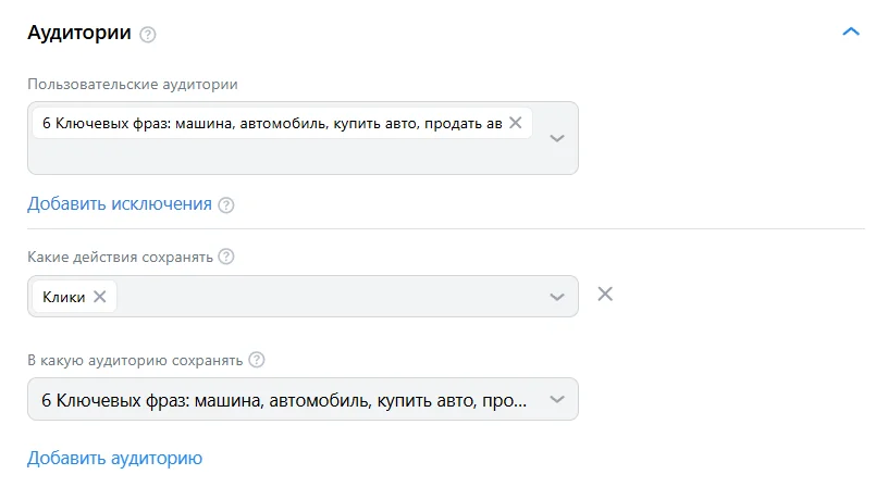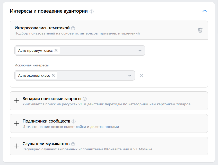 Интересы и поведение. Помогает показывать рекламу тем людям, которые интересуются связанной с ней темой. Здесь же можно разные темы исключать. Например, если человек интересуется тяжелой техникой и спецтранспортом, вряд ли ему будут интересны авто премиум-класса.