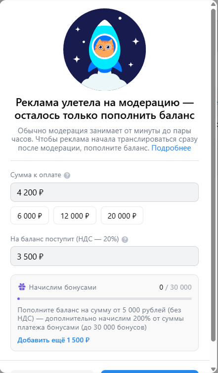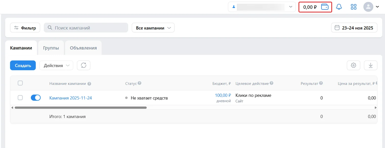 После создания объявления вы попадете на главный экран рекламного кабинета. Чтобы реклама начала показываться, нужно пополнить кошелек. Нажмите на верхней панеле на кошелек и следуйте инструкциям: