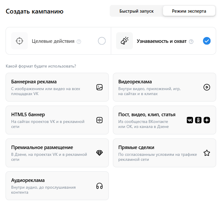 Во второй группе кампания нацелена на повышение узнаваемости бренда. Она поможет увеличить охват и привлечь новую аудиторию. Оплата за показы рекламы (CPM) или за досмотры (CPV).
