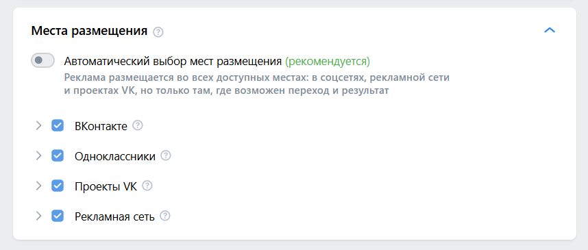 ВКонтакте владеет Одноклассниками и медиапроектами VK, например, Mail.ru. При включенном чекбоксе «Автоматический выбор мест размещения» реклама будет показываться везде.