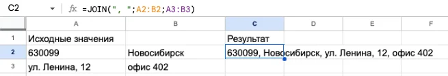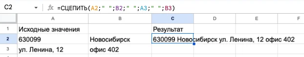 Обратите внимание, что значения в строках объединяются без пробелов. Если они необходимы, то добавьте их в формулу — вручную проставив пробелы после каждой строки.
