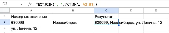 Обратите внимание, в качестве аргумента функции может быть либо строка, либо столбец. Если необходимо объединение данных из диапазона ячеек, тогда нужно указывать в функции несколько строк или столбцов.