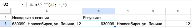 Эта функция разделяет текст по разным ячейкам. Её можно использовать, если в одну ячейку выгрузились два email-адреса, или мы хотим город, улицу, номер дома написать в каждой ячейке отдельно.