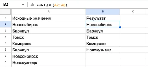 по_столбцам — определяет, как фильтровать данные. Если нужно отфильтровать по столбцам, ставьте значение ЛОЖЬ (FALSE), а если по строкам — значение ИСТИНА (TRUE). По умолчанию в функции стоит значение ЛОЖЬ (FALSE), поэтому новые данные без дубликатов появляются в соседнем столбце;