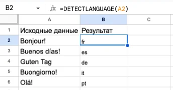 =DETECTLANGUAGE(текст_или_диапазон)