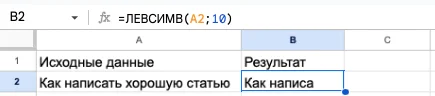 Эта функция показывает заданное количество символов с начала строки. С помощью этой функции мы можем посмотреть, уместится ли заголовок в нужное количество знаков, или как обрежется тема письма в мобильных приложениях.