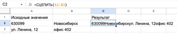 =СЦЕПИТЬ(строка 1; строка 2)
