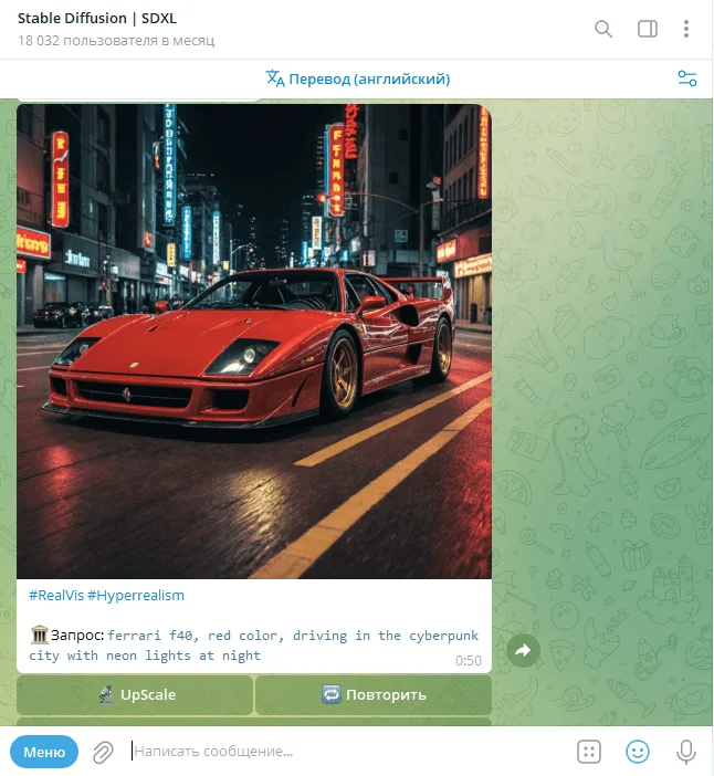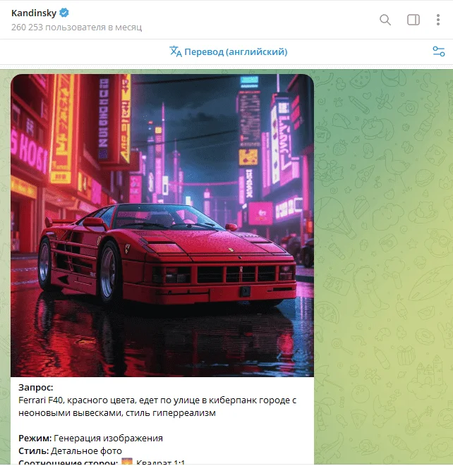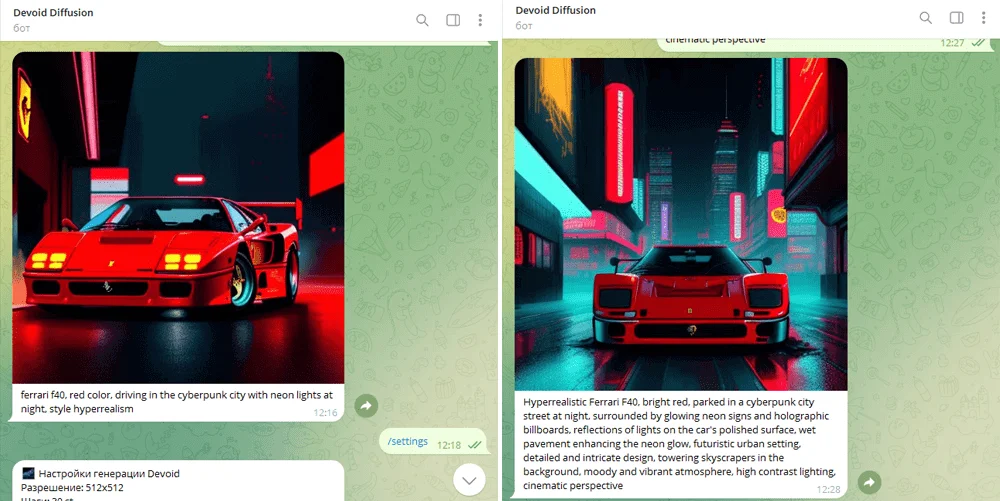 Рассмотрим несколько Telegram-ботов для генерации изображений. Чтобы сравнить их эффективность, попросим ботов сгенерировать красную Ferrari F40 на улицах киберпанкового города с неоновыми вывесками в стиле гиперреализм.