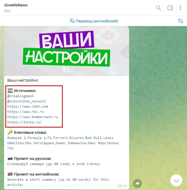 Допустим, вы ведёте канал с новостями про «Формулу-1». Обновляете ключевые слова, вносите туда главных ньюсмейкеров по теме, а затем нажимаете кнопку генерации новостей. По умолчанию бот ищет новости в РБК, Коммерсант, Lenta и других авторитетных отечественных источниках.