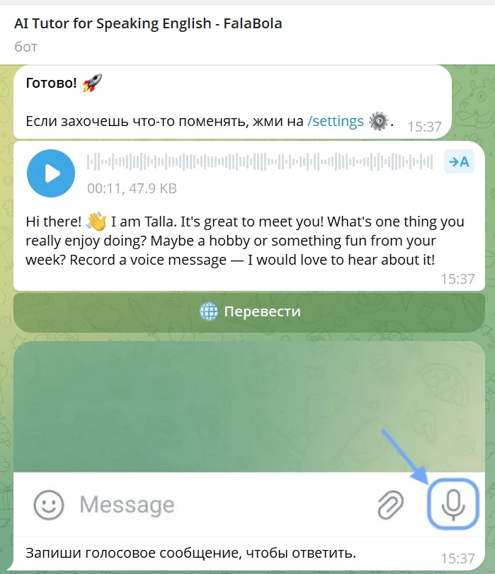 Telegram-бот хорошо подходит и для новичков: нейросеть подстраивается под уровень и темп обучения пользователя, голосовые сообщения легко расшифровать и перевести. Плюс можно изменить скорость речи.