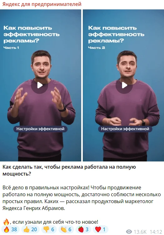 Интересные посты. Продуктовый маркетолог Яндекса Генрих Абрамов в двух коротких видео дал практические советы, как повысить эффективность рекламы в Яндекс Бизнесе. Он рассказывает, почему в первые недели не стоит трогать рекламные настройки, почему нужно наблюдать за конкурентами и как помочь алгоритмам правильно подобрать аудиторию.