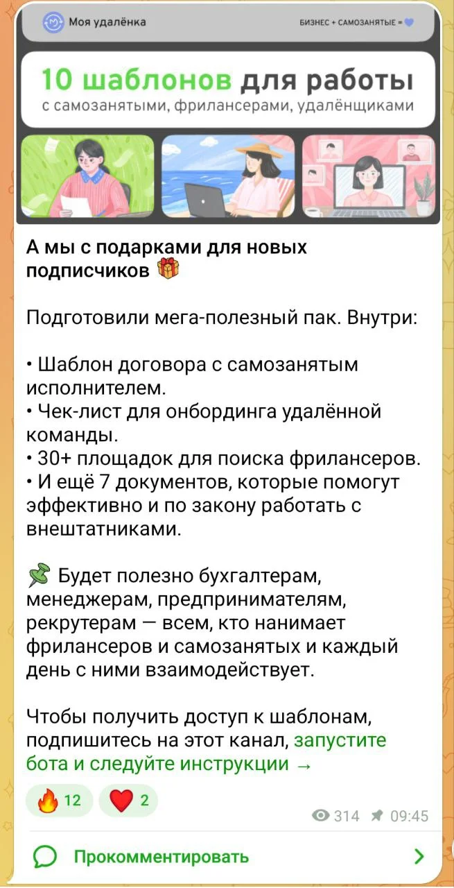 А еще все подписчики канала могут получить в подарок «10 шаблонов для работы с самозанятыми, фрилансерами и удаленщиками». Шаблоны помогут составить договор, акт и платежное поручение, а также эффективно проводить рабочие созвоны и онбординги команды.