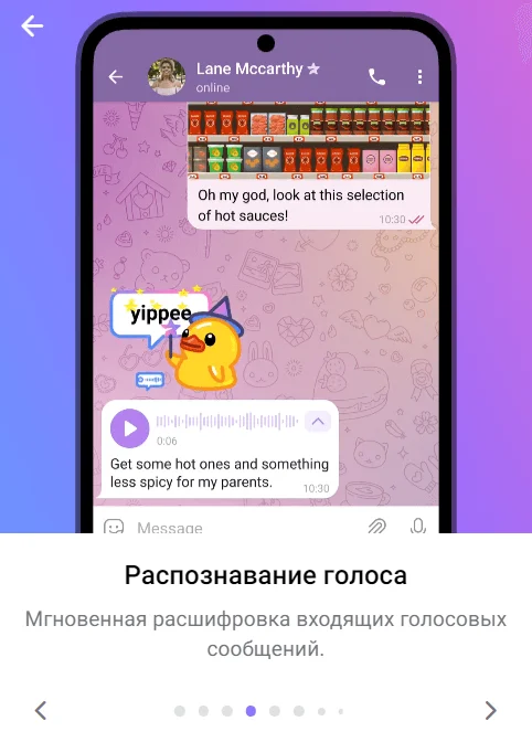 Распознавание голоса. Входящие голосовые сообщения мгновенно дешифруются и их можно прочесть в текстовом формате.