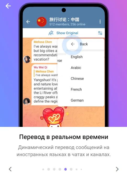 Перевод в режиме реального времени. Мессенджер переводит сообщения на иностранном языке в чатах и каналах. Причём можно использовать функцию в любом предназначении — прочитать полученное сообщение или перевести на другой язык отправляемый текст.