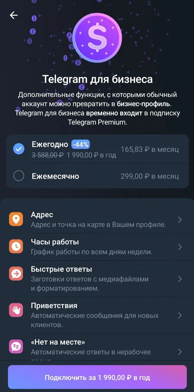 Telegram для бизнеса. Пока эта возможность входит в подписку Premium. Telegram для бизнеса позволяет превратить обычный аккаунт в бизнес-профиль. Например, можно указать адрес и точку на карте в профиле, график работы, настроить быстрые ответы (шаблоны) и автоматические приветствия, ответы в нерабочее время, ссылки для открытия чата с подстановкой текста. Также можно делать чат-боты.