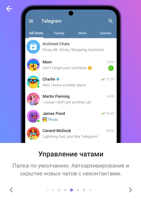 Оптимизация коммуникаций. Распределение по папкам, закрепление чатов, автоматическая архивация — всё это упрощает общение.