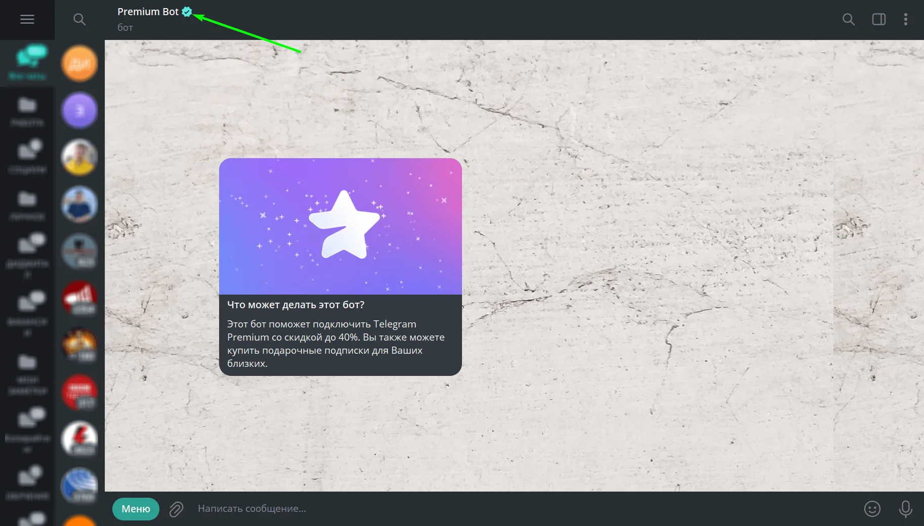 Перейти в @PremiumBot по ссылке либо найти бота через поиск. Учитывайте, что официальный аккаунт имеет значок верификации.