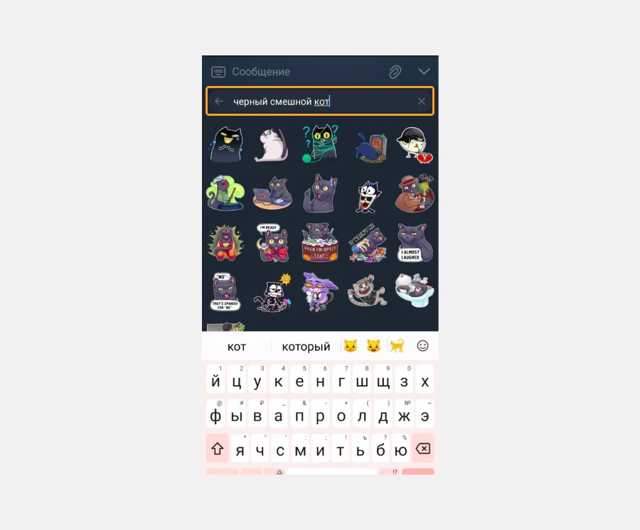 Также появились подсказки над строкой ввода, например, пользователь вводит слово «кот» и вверху появятся соответствующие эмодзи и стикеры.