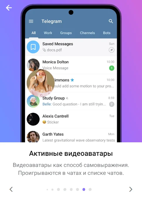 Активные видеоаватары. В качестве аватара можно использовать видео, которое проигрывается в профиле, списке чатов и чатах.