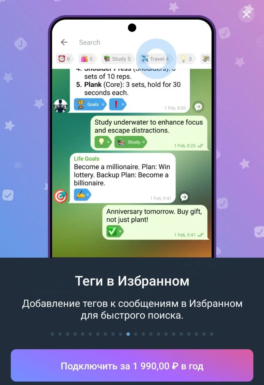 Теги в избранном. Можно добавлять теги к сообщениям в «Избранном», чтобы быстро искать нужную информацию.