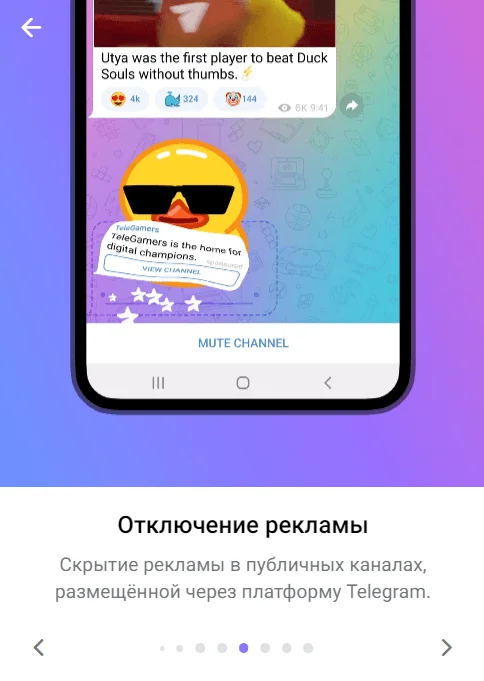 Отключение рекламы. В публичных каналах скрывается вся реклама, которая размещена через платформу Telegram.