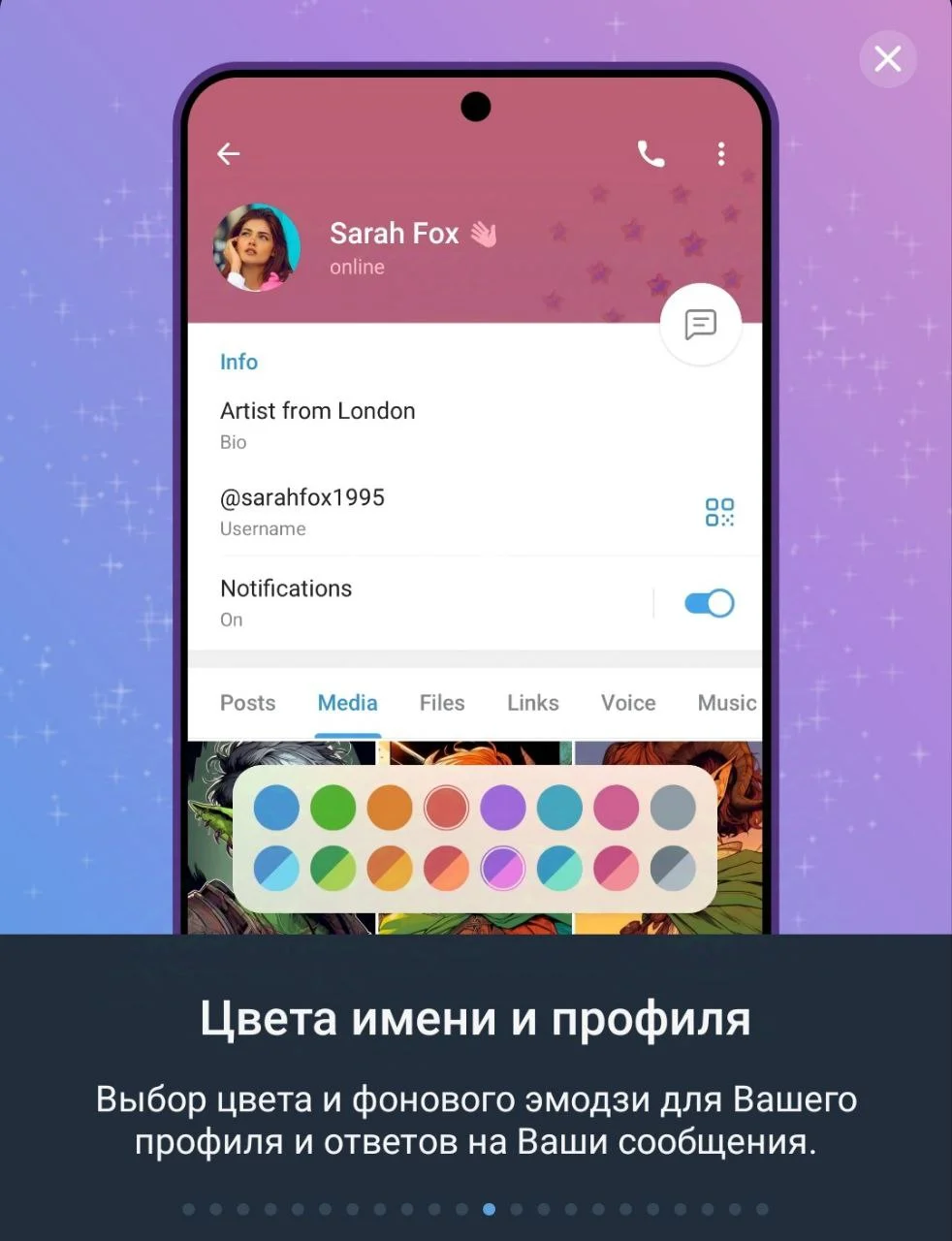 Цвета имени и профиля. Эта функция позволяет выбрать цвет и фоновые эмодзи для своего профиля и ответов на сообщения.