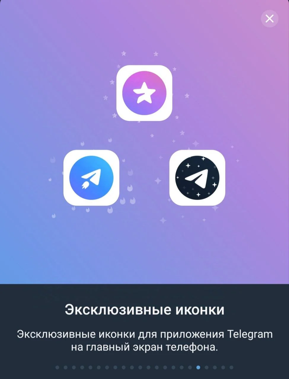Эксклюзивные иконки для приложения. Можно изменить иконку мессенджера на главном экране телефона: использовать не стандартный бумажный самолет, а например, звездочку.