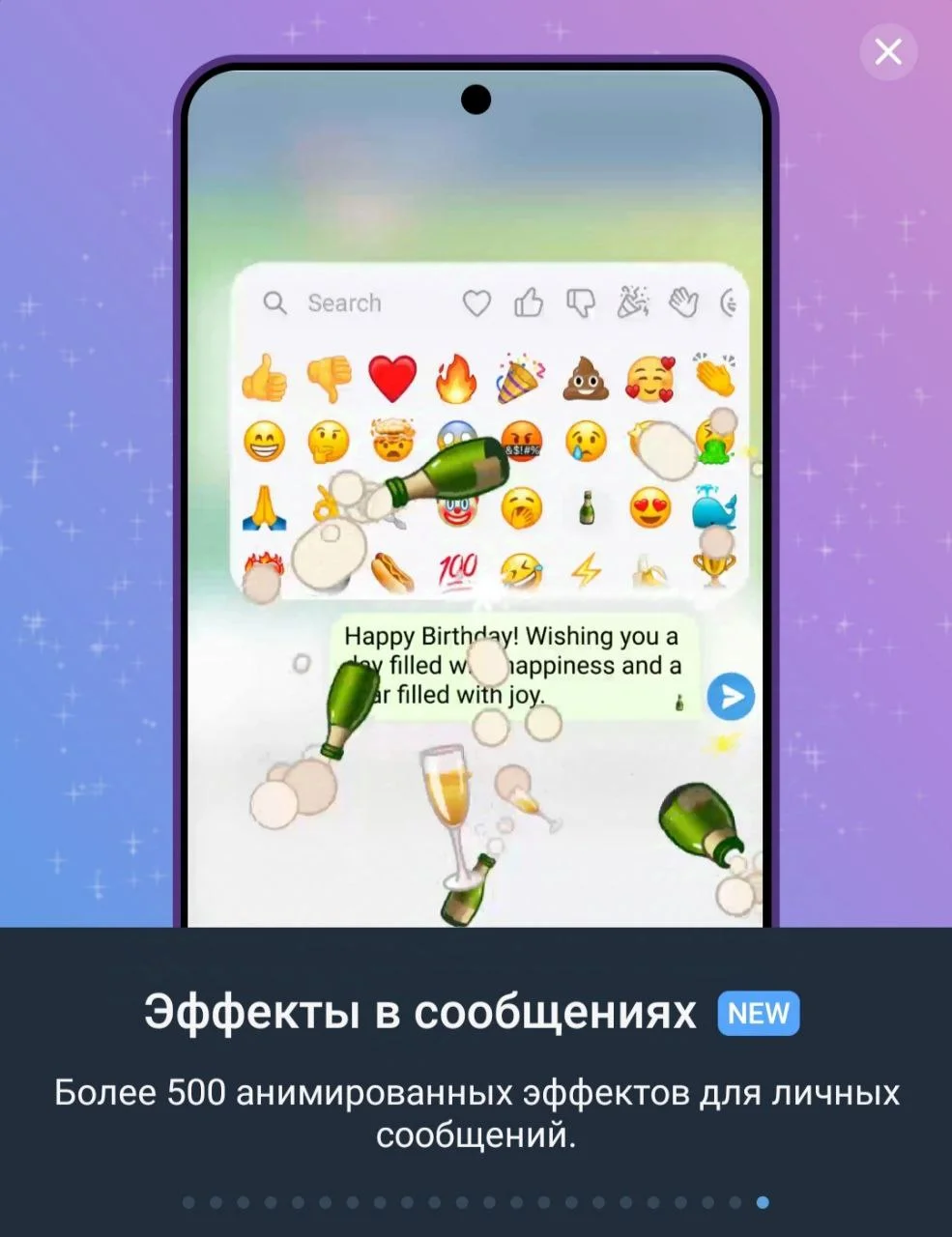 Эффекты в сообщениях. В личных сообщениях можно добавлять анимированные реакции к сообщениям: доступно около 500 анимированных реакций.