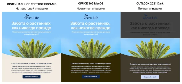 Инверсия цвета. Пожалуй, самый неприятный из-за своей непредсказуемости вариант поведения почтового клиента: он может инвертировать цвета вашего письма целиком или частично — и зачастую это выглядит не слишком приятно. Частичная инверсия ещё ничего: обычно она подразумевает только замену светлого фона на тёмный, а тёмного текста — на светлый.
