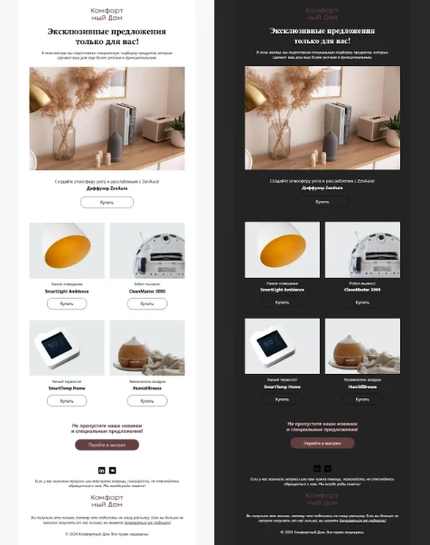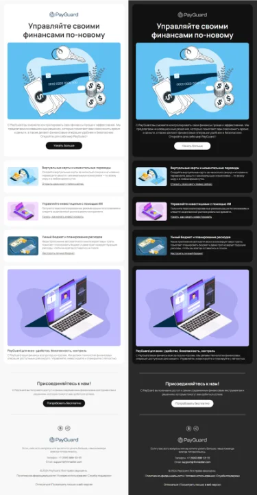 В почтовых клиентах Apple Mail и Mail.ru можно настроить индивидуальный дизайн для светлой и тёмной темы. Разберём этот способ на примере одного из шаблонов EmailMaker.