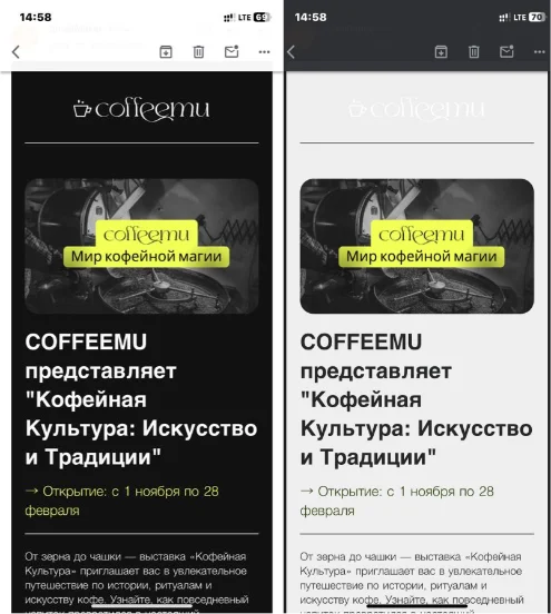 И вот представьте: на устройстве, где установлена тёмная тема, пользователь открывает почтовый клиент, где тоже всё тёмное, видит письмо, кликает… и глаза выжигает яркий белый свет с экрана. У него должна быть очень большая мотивация прочесть письмо. В противном случае человек, скорее всего, поспешит закрыть окно — и не факт, что откроет ваши письма в будущем.