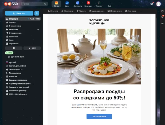 Короткий ответ — тоже по-разному. В Яндекс Почте можно установить тёмную тему, но она не повлияет не только на само письмо, но даже на фон, на котором оно расположено. Никакой инверсии, и поддержки тёмной темы, заданной через CSS, тоже никакой.