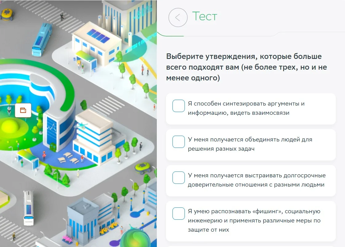 Особенности: мини-тест состоит из 7 вопросов. В первых двух нужно выбрать один вариант ответа, далее — от одного до трех наиболее подходящих вам утверждений. Также на сайте есть карта современных профессий с характеристиками: перспективы, обязанности, необходимые знания и навыки, список учебных программ во ВШЭ, стажировки и вакансии от Сбера.
