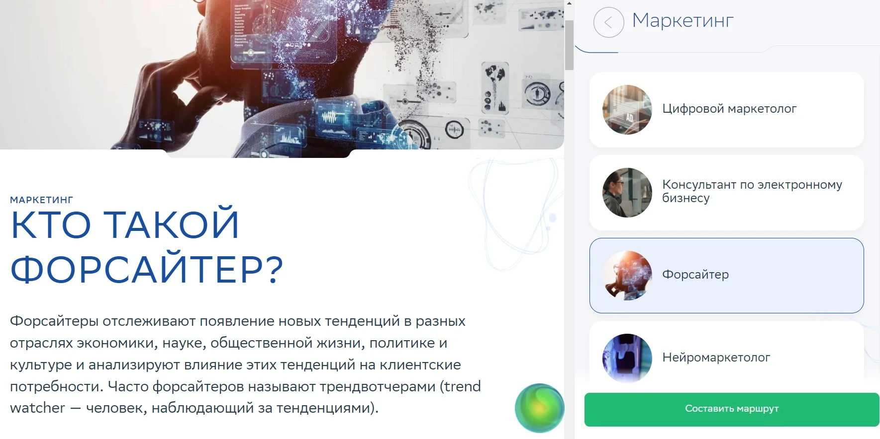 Особенности: тест разработан экспертом-профориентологом. Он поможет найти диджитал-профессию, учитывая ваши интересы и личностные особенности. Вопросы довольно очевидные, например, если на вопрос «какая сфера вас больше всего интересует?» выбрать маркетинг, то результатах теста будут профессии, связанные с маркетингом.
