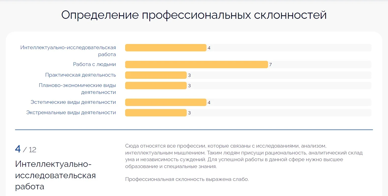 В кратком отчете покажут 7 подходящих профессий и приоритеты профессиональной деятельности. В полном отчете с графиками на 17 листов дополнительно раскрываются еще 3 профессии, профессиональные склонности, структура личности и интеллекта. А еще дают рекомендуемые направления и специализации обучения.