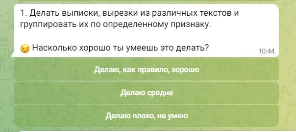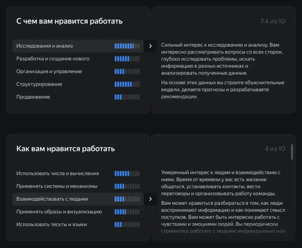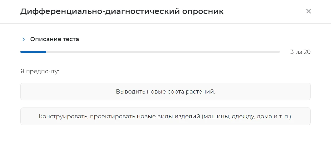 Особенности: школьникам предлагают ответить на три блока с вопросами, а взрослым — на шесть. Можно сделать перерыв и продолжить в удобное время. В разных блоках есть вопросы на интересы (нравится определенное занятие или нет), про личностные особенности (например, характера), а также оценка профессиональной готовности. На некоторые утверждения нужно ответить три раза, например: