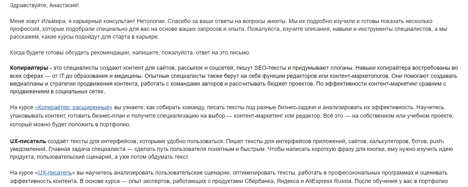 Особенности: в тесте есть короткие видео про разные сферы и анкета, после заполнения которой на почту присылают индивидуальные рекомендации от карьерных консультантов по подходящим профессиям и плану обучения. К анкете можно прикрепить резюме.
