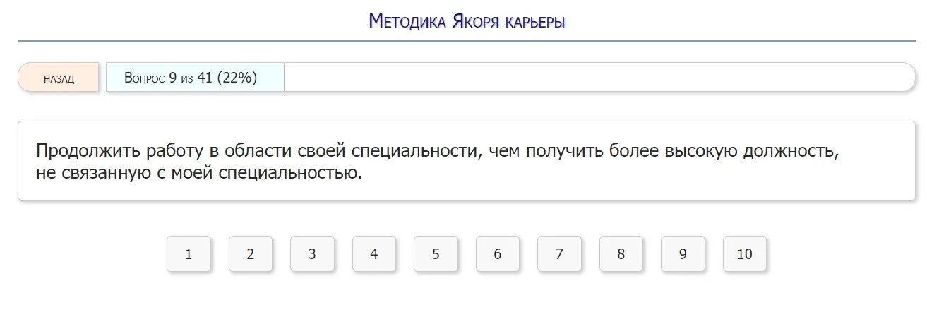 Особенности: в тесте даются утверждения, на которые нужно ответить по 10-бальной шкале, насколько это важно для вас, где 1 — это совсем не важно, а 10 — очень важно. Всего в тесте 41 вопрос.