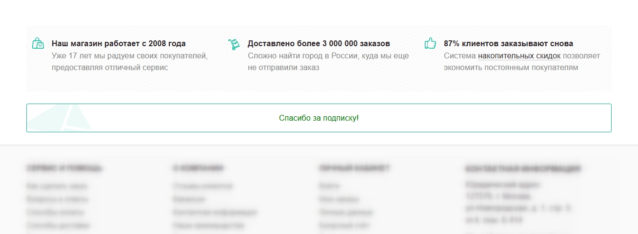 Страница благодарности — то, что видит пользователь после того, как подписался на рассылку, либо подтвердил подписку, перейдя по ссылке в письме (double opt-in). В первом случае такие страницы, как правило, лаконичны: их основная цель — дать понять пользователю, что действие совершено успешно и поблагодарить за него.