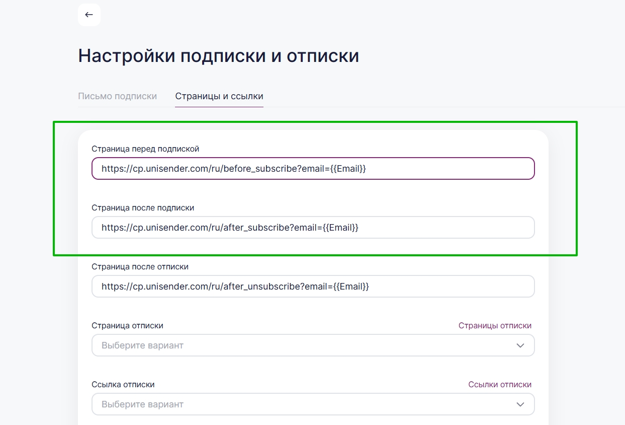 Чтобы настроить страницу после подписки, откройте нужный список контактов, нажмите на шестерёнку справа над ним, а затем выберите «Подписки и отписки». В открывшейся вкладке добавьте URL страниц в соответствующую графу.