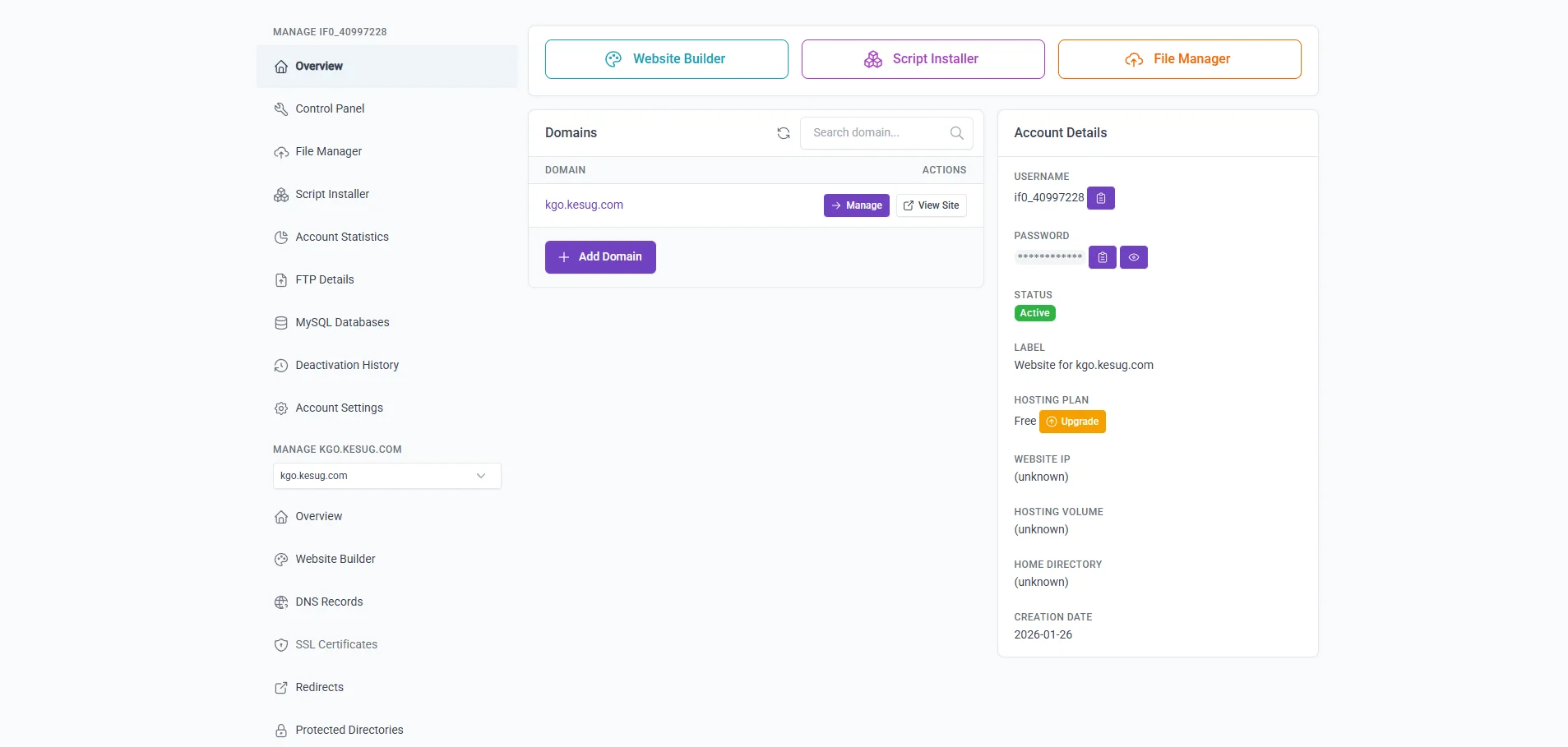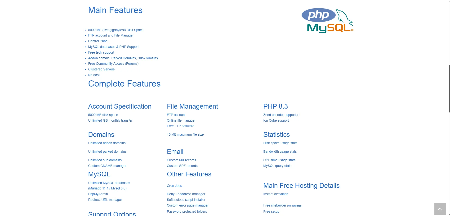 Зарубежный провайдер с дизайном из 2008 года, зато с условиями из 2026: безлимит по размеру диска, количеству баз данных и трафику. Ещё и техподдержка есть. Для регистрации нужно указать поддомен и email-адрес.
